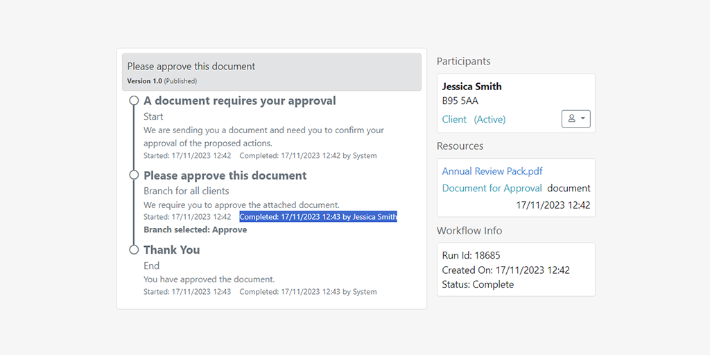 A document viewing reports and read histories on secure messages, you always know when your clients have read the communications you send them. Workflows allow you to easily gain your client's approval on important documents such as suitability reports or portfolio alterations.