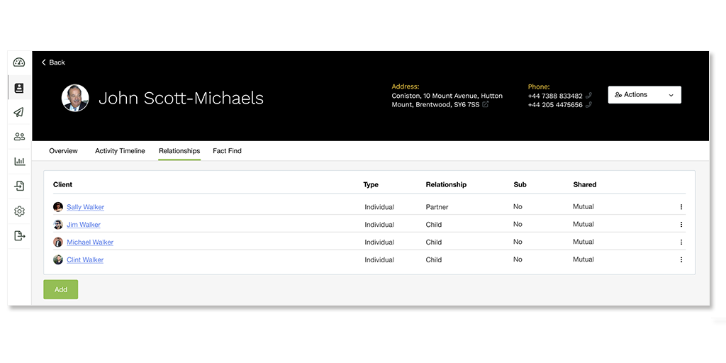 Your clients and their partner, dependents, trusts, companies or other accounts are linked together by relationships allowing you to easily understand the household group and your client's wider network.