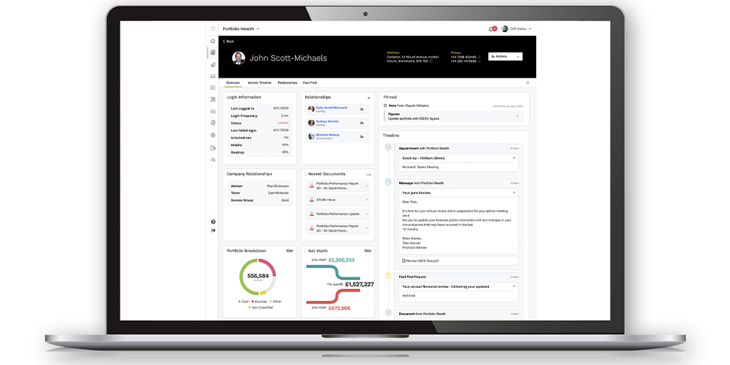 Access an easy-to-read, dashboard-style summary of your clients' activities, portfolio values, net worth, and linked relationships - all in one place. For full transparency, you can also view communication timelines and a documentation overview, giving you a complete, holistic view of each client’s journey.