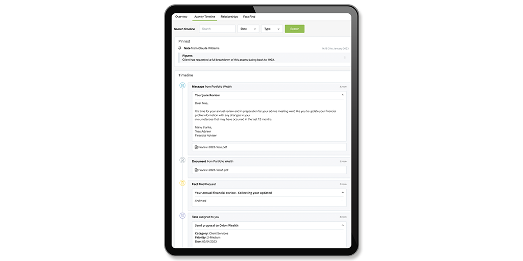 The activity timeline provides you with an easy to view compliance audit trail of all interactions relating to your client. Easily filter or search for specific types of activity, helping you to get prepared for your next client meeting or to see the latest advice recommendations.