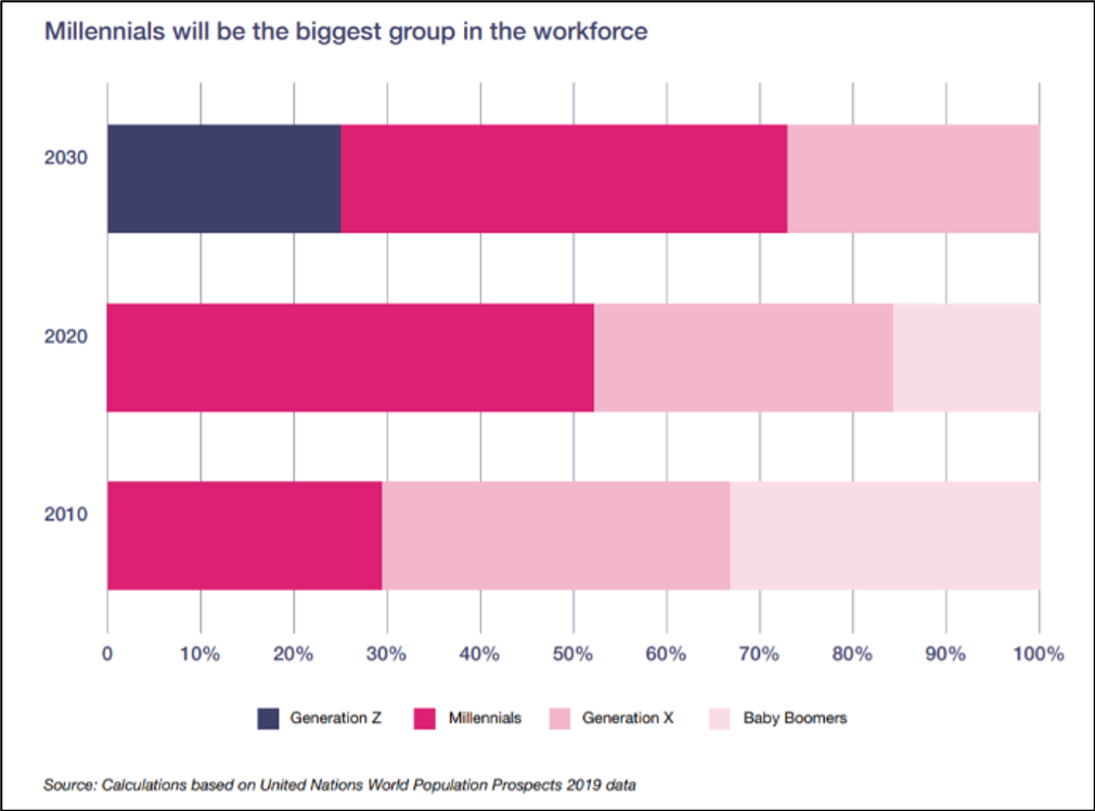 Millennials make up almost one-third of the global population and account for around half of the global workforce. Together with their successors (known as Generation Z), they will account for almost three-quarters of the workforce by 2030 – replacing the baby boomers and Generation X who drove the economy in recent decades.